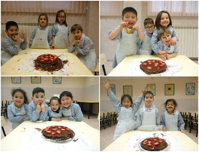Sólo quedaban poner las fresas encima y dejarlas un ratito en el frigo. Salieron cuatro tartas buenísimas y ellos se lo pasaron en grande haciéndolas y sobre todo, probando todo!!