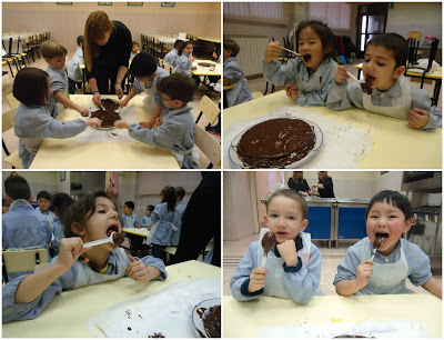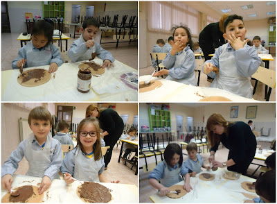 Los peques lo habían llamado: «La fiesta del chocolate» porque sabían que había chocolate, pero no sabían lo que iban a hacer. Llegada la tarde, bajamos al comedor del cole y allí nos esperaban dos mamás para explicarnos en qué iba a consistir el taller.