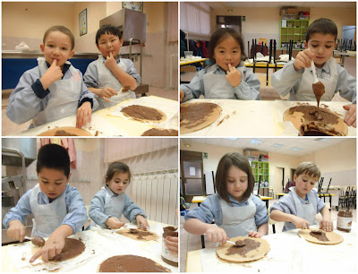Los peques entraron al comedor y por grupos comenzaron a hacer sus tartas. Los ingredientes que necesitaban eran: barquillos, nocilla, fondue de chocolate y fresas. Primero, fueron untando con nocilla los barquillos. Con mucho cuidado iban pasando la cuchara para no dejar ni un hueco sin rellenar. Algunos se rompían, pero no pasaba nada porque esos trocitos no los tiraban… se los comían!! jejeje