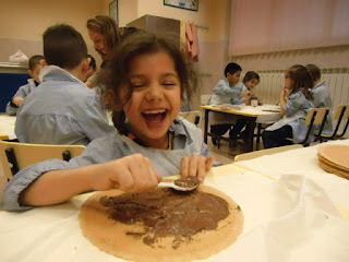 Los peques entraron al comedor y por grupos comenzaron a hacer sus tartas. Los ingredientes que necesitaban eran: barquillos, nocilla, fondue de chocolate y fresas. Primero, fueron untando con nocilla los barquillos. Con mucho cuidado iban pasando la cuchara para no dejar ni un hueco sin rellenar. Algunos se rompían, pero no pasaba nada porque esos trocitos no los tiraban… se los comían!! jejeje